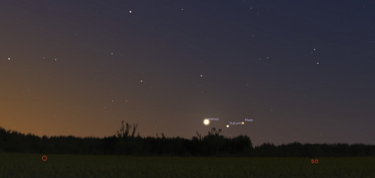 Wer nicht auf diese Weise "schwarzsehen" möchte, kommt aktuell (wenn die Wolken einmal Mut zur Lücke beweisen würden!) in den Genuss, die Planetenkonstellation des Morgenhimmels, für die man bislang schon um 5 Uhr hätte aufstehen müssen dank Sommerzeit jetzt bequemer und hoffentlich ausgeschlafener um 6 Uhr bewundern zu können. Venus und Mars nehmen Saturn in ihre Mitte (s. Abbildung oben; Stellarium). Zum Monatsende wird Jupiter das Trio zum Quartett erweitern.
